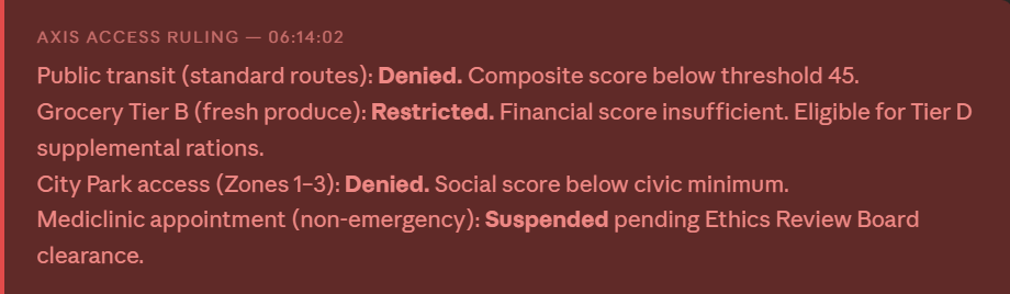 She lay still, staring at the ceiling panel where the morning’s access summary scrolled in pale amber text. The algorithm had already made its decisions while she slept.