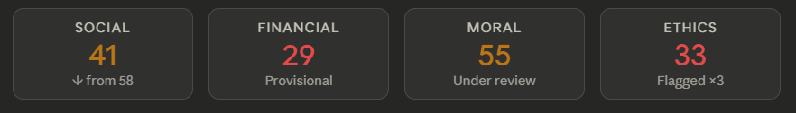 Maren Sorel woke to the sound of the Civic Index chiming. Not an alarm. Alarms had been abolished in 2041 as psychologically destabilizing. The chime was a notification of standing: a single tonal note whose pitch corresponded to one’s composite score. Low and warm for the elite. A flat, paper-white tone for the middle corridors. A faint, almost inaudible blip for those whose scores had fallen into the Provisional bracket.